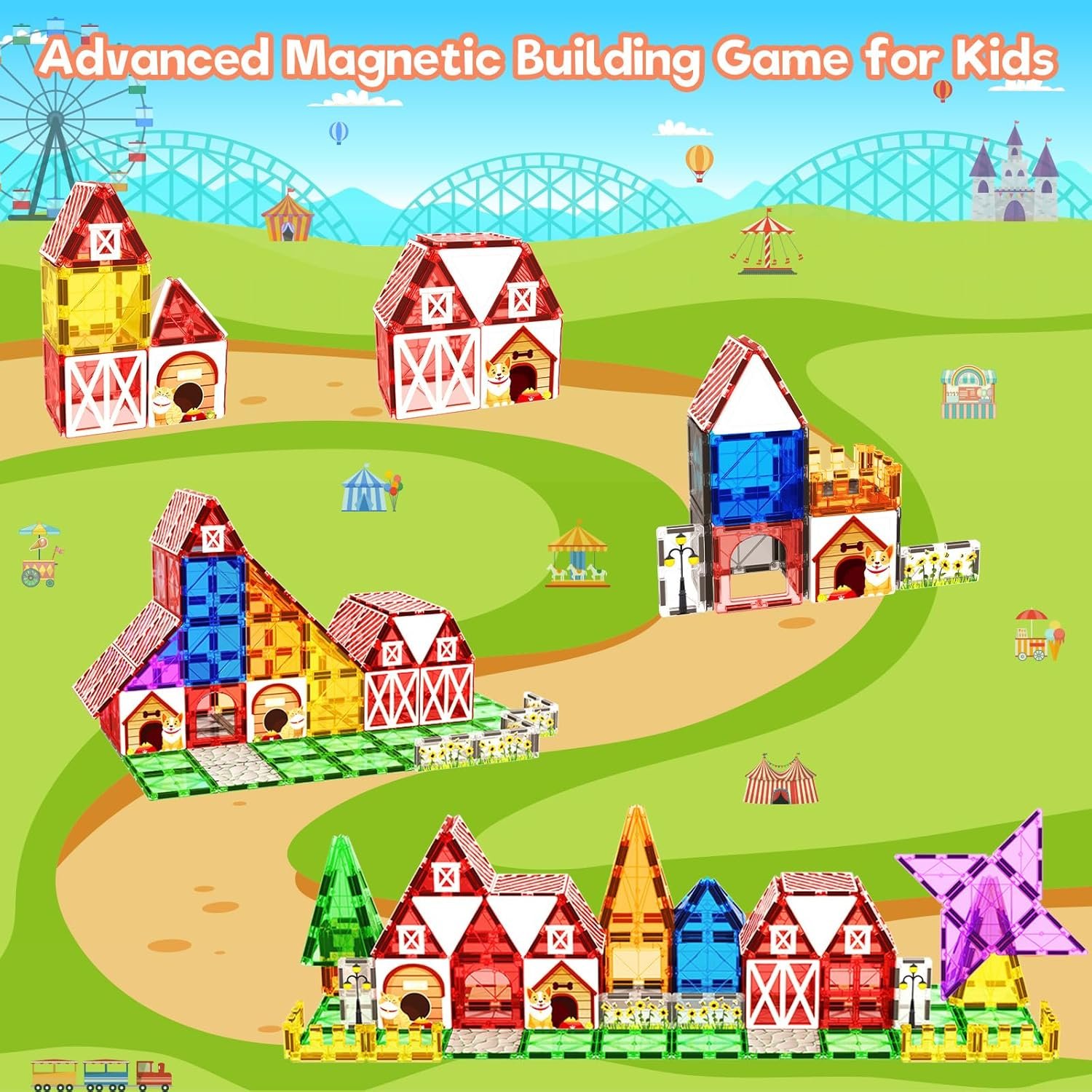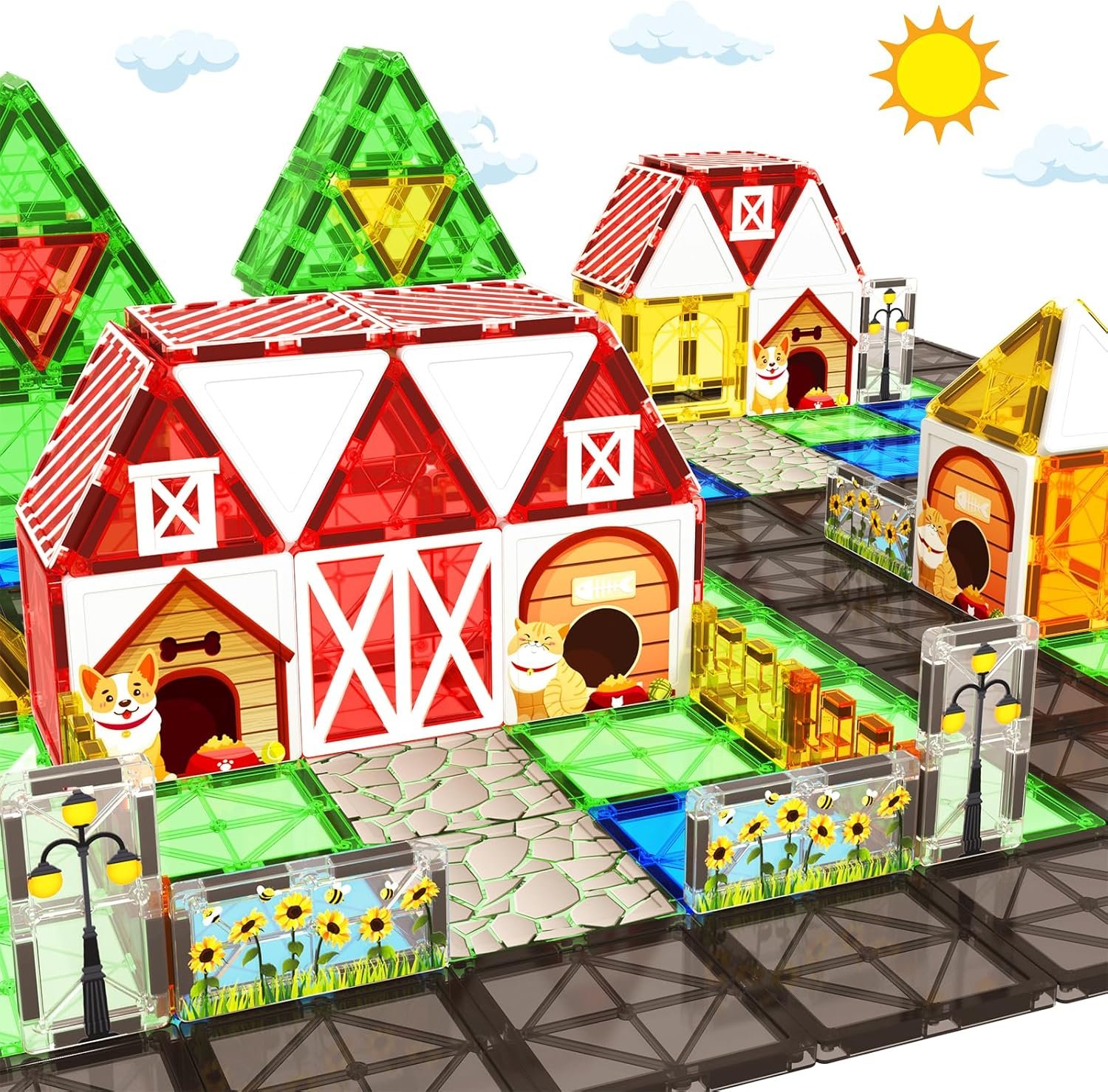 - Farm House Themes – Well-designed 39pcs magnetic tiles give kids a different farm garden house building experience. It comes with multiple shapes and colors, including squares, rectangles, fence and various triangles, together with the printing of various patterns. Construction toys for ages 3+ boys girls.