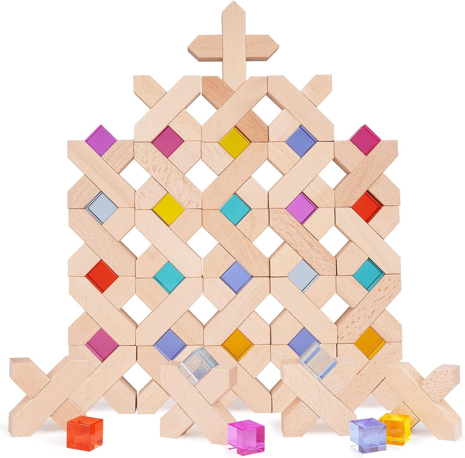 - ✓ ACRYLIC RAINBOW BLOCKS SET – We have included 32 elegant wooden blocks that measure 4 inches each, making them convenient to grab for small hands, and 48 pieces of rainbow acrylic cube blocks in 8 different colors including red, yellow, blue, green, indigo, orange, purple and silver. Each rainbow cube block is 1 inch in size!