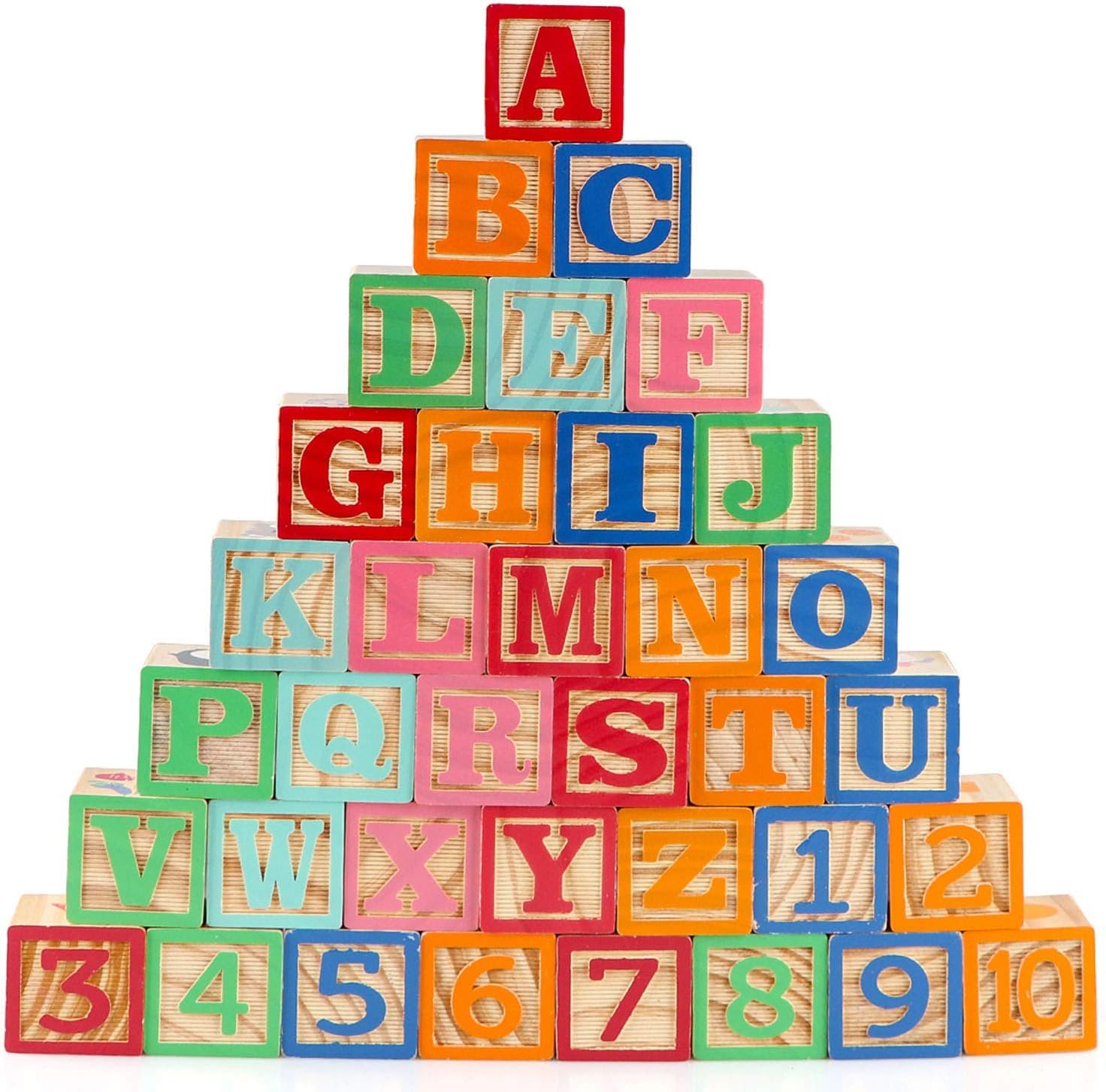 - Alphabet for Kids : Wooden ABC building blocks contain 26 alphabet and 10 counting, block one side is uppercase letter and The other side of the uppercase letter is the lowercase of the same letter, besides blocks for toddlers contain colorful shapes, animal, fruits, vegetables
